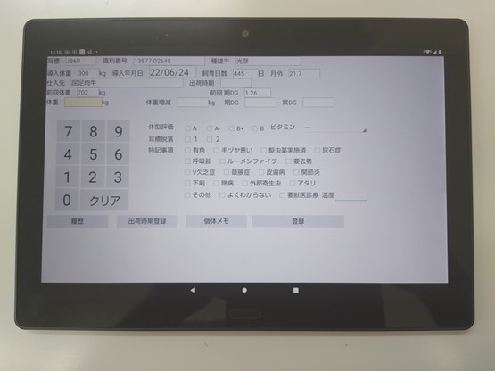 当牧場では、オリジナルの牧場管理システムを使って、牛の導入から出荷までを管理しています。 誰でも簡単に操作が出来る為業務効率が著しく向上しまた原価管理の面でも役立っています。